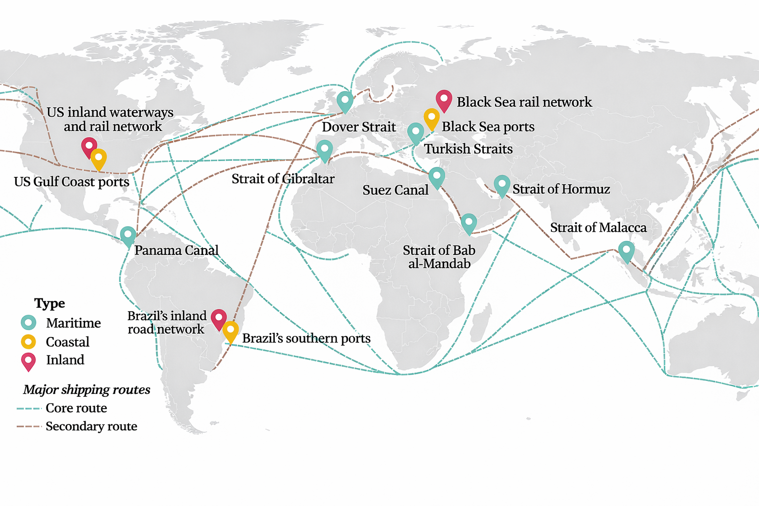 Geographic and corporate concentration converge on a third vulnerability: the infrastructure through which fertilisers must travel before they ever reach a field. That infrastructure runs through a small number of chokepoints, all of which are exposed to disruption by conflict, sanctions, or accident.